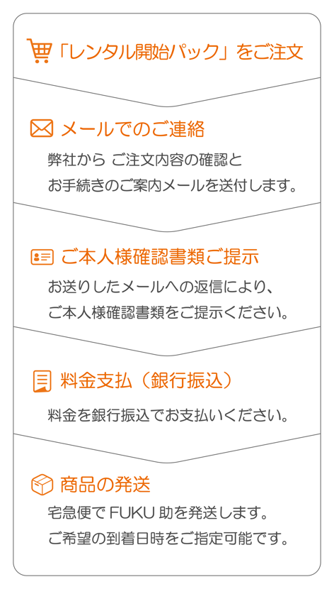 オンラインストアでは、宅配によりFUKU助を日本全国へ最短3日でレンタルしています。